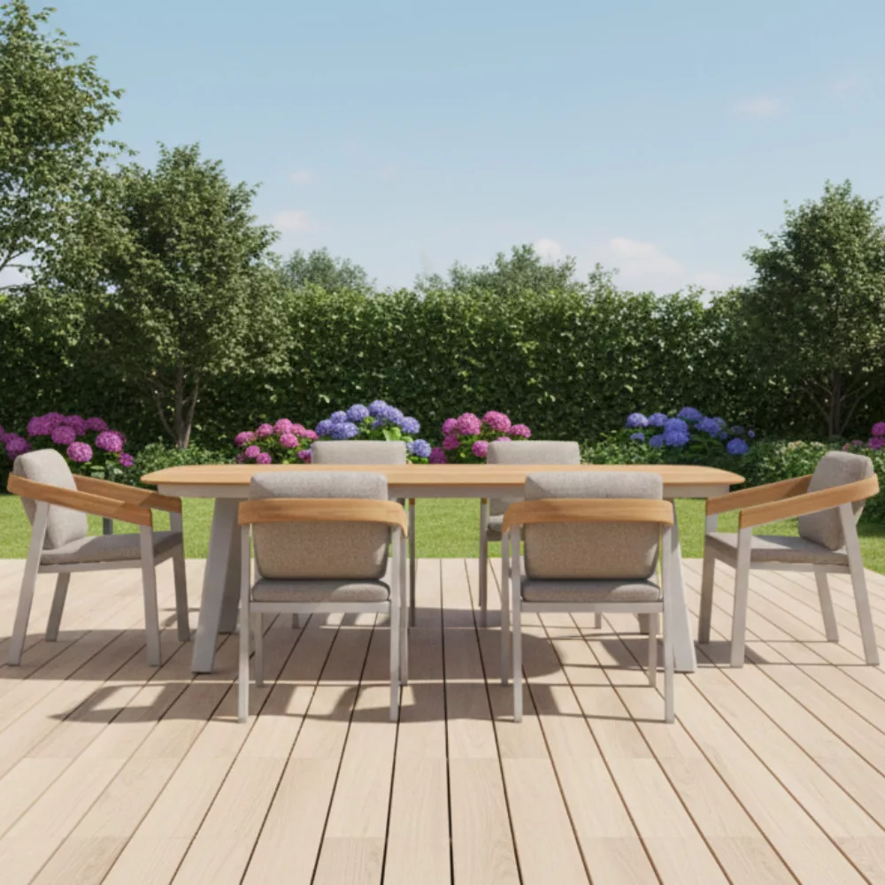 Zestaw stołowy MOLTO został zaprojektowany z myślą o funkcjonalności i estetyce. Malowana proszkowo aluminiowa rama zapewnia odporność na korozję, a kompozytowy blat dodaje wyrafinowanego charakteru. Jego duża powierzchnia (240 x 110 cm) zapewnia wygodne siedzenia dla sześciu osób, idealne zarówno do codziennych obiadów, jak i większych spotkań w ogrodzie lub na tarasie. Materiał kompozytowy jest stabilny wymiarowo i łatwy w czyszczeniu, co czyni go jednym z najbardziej praktycznych materiałów do mebli ogrodowych.