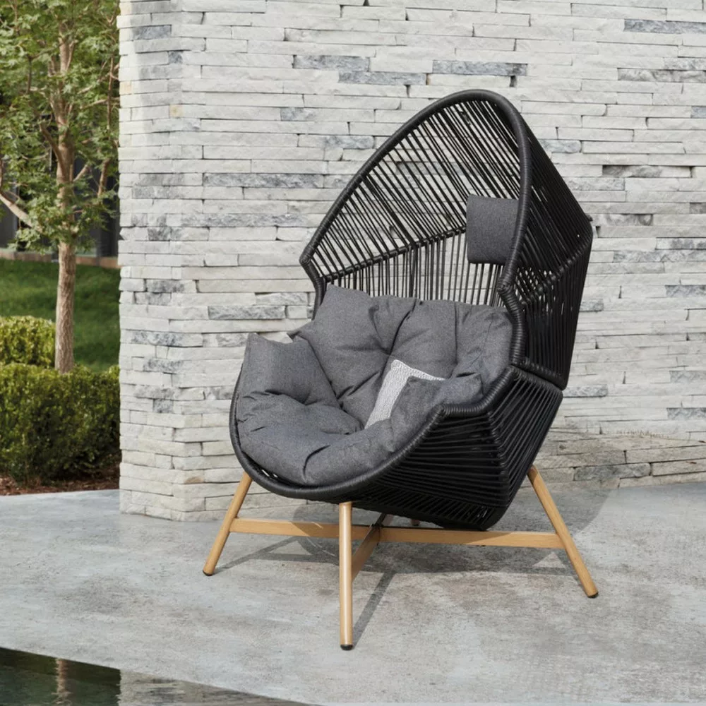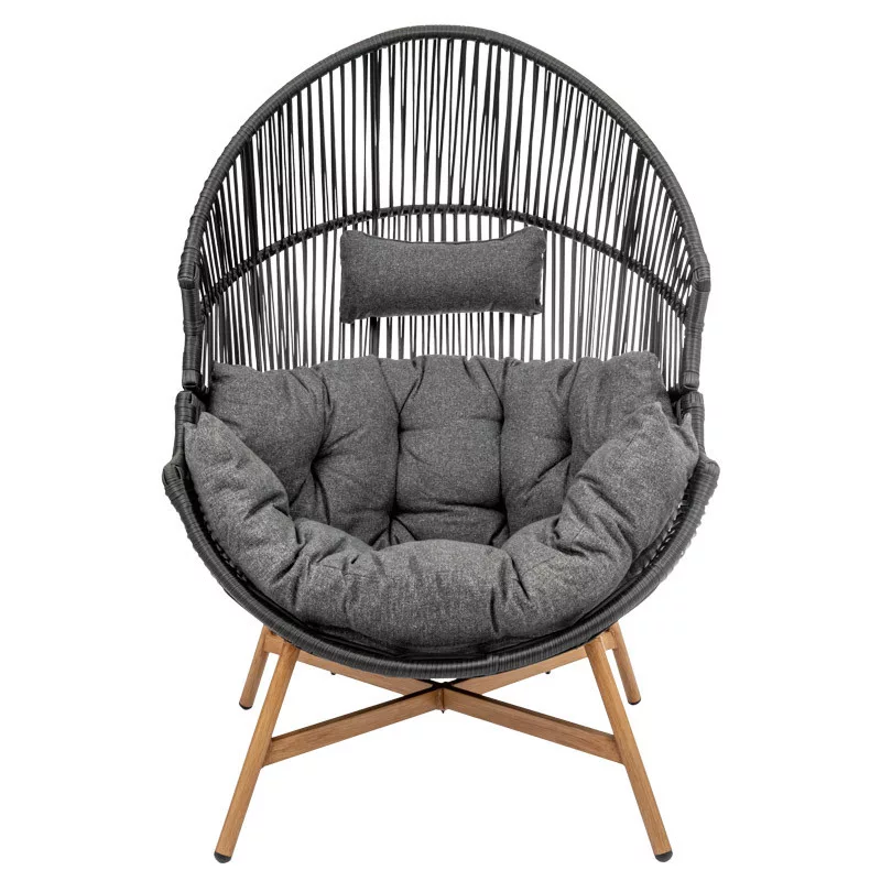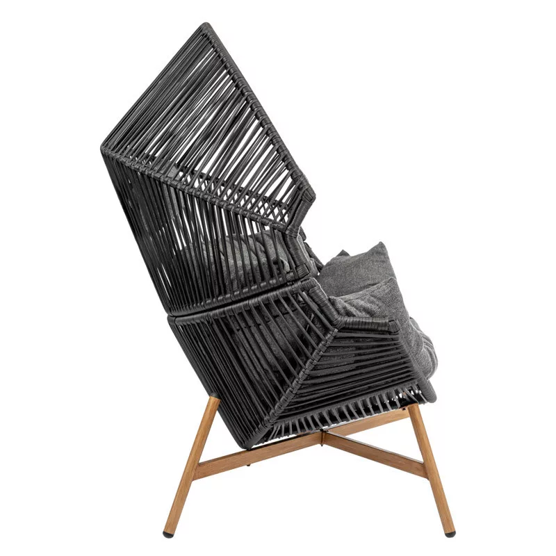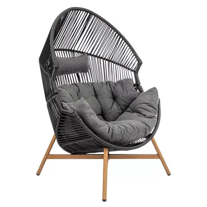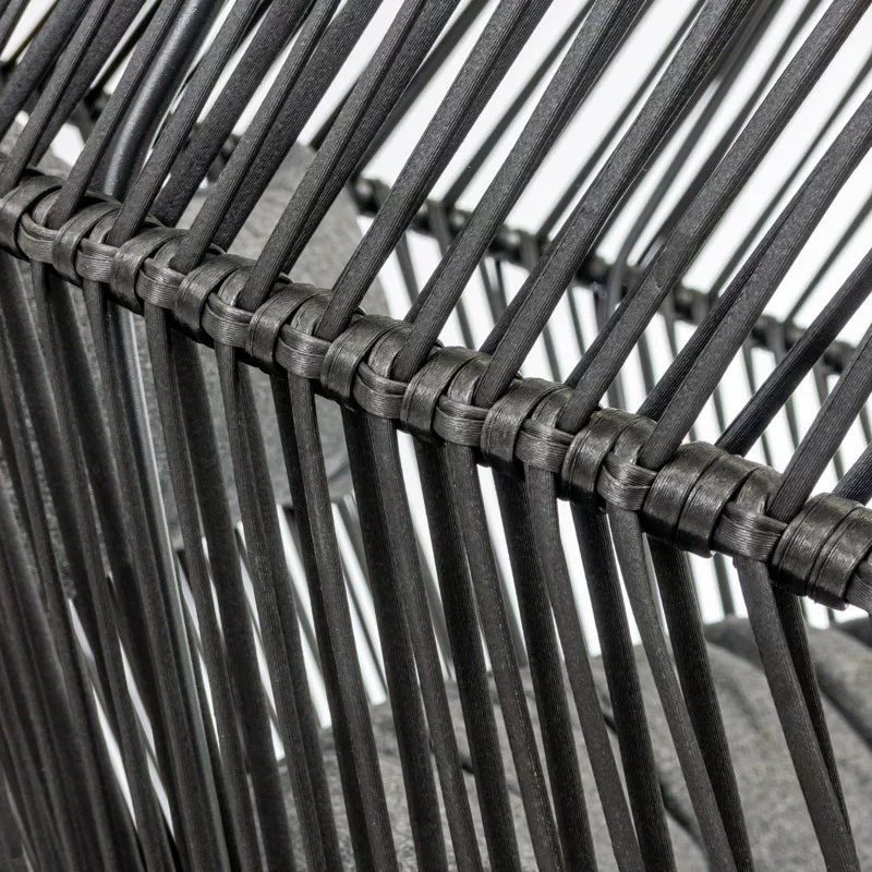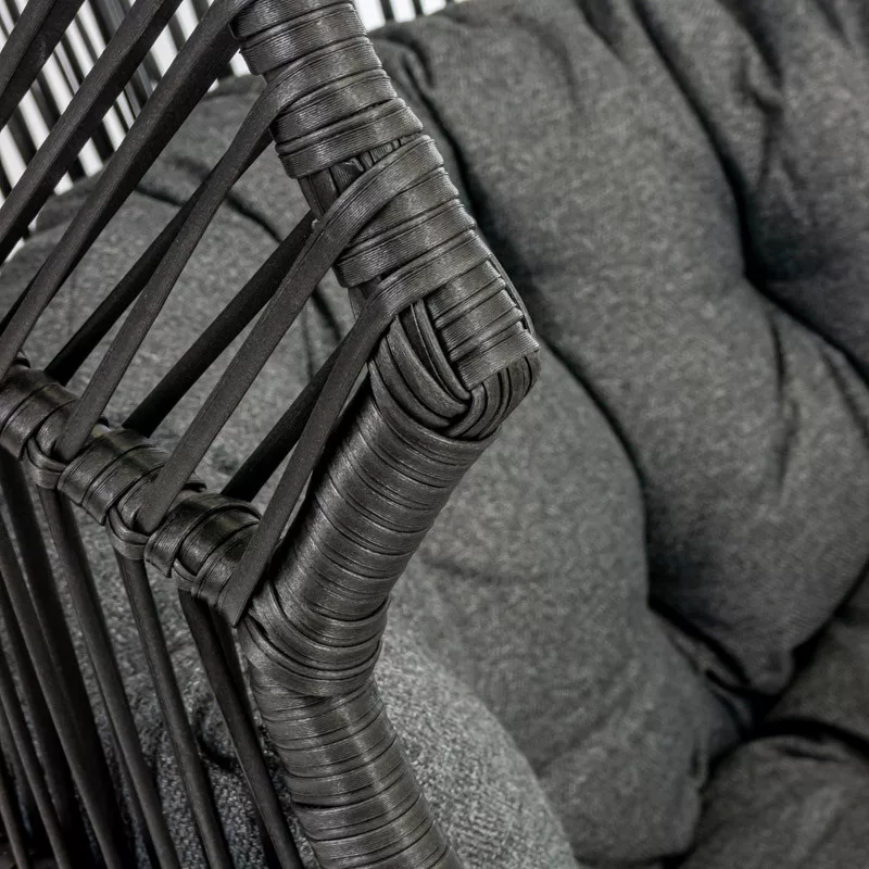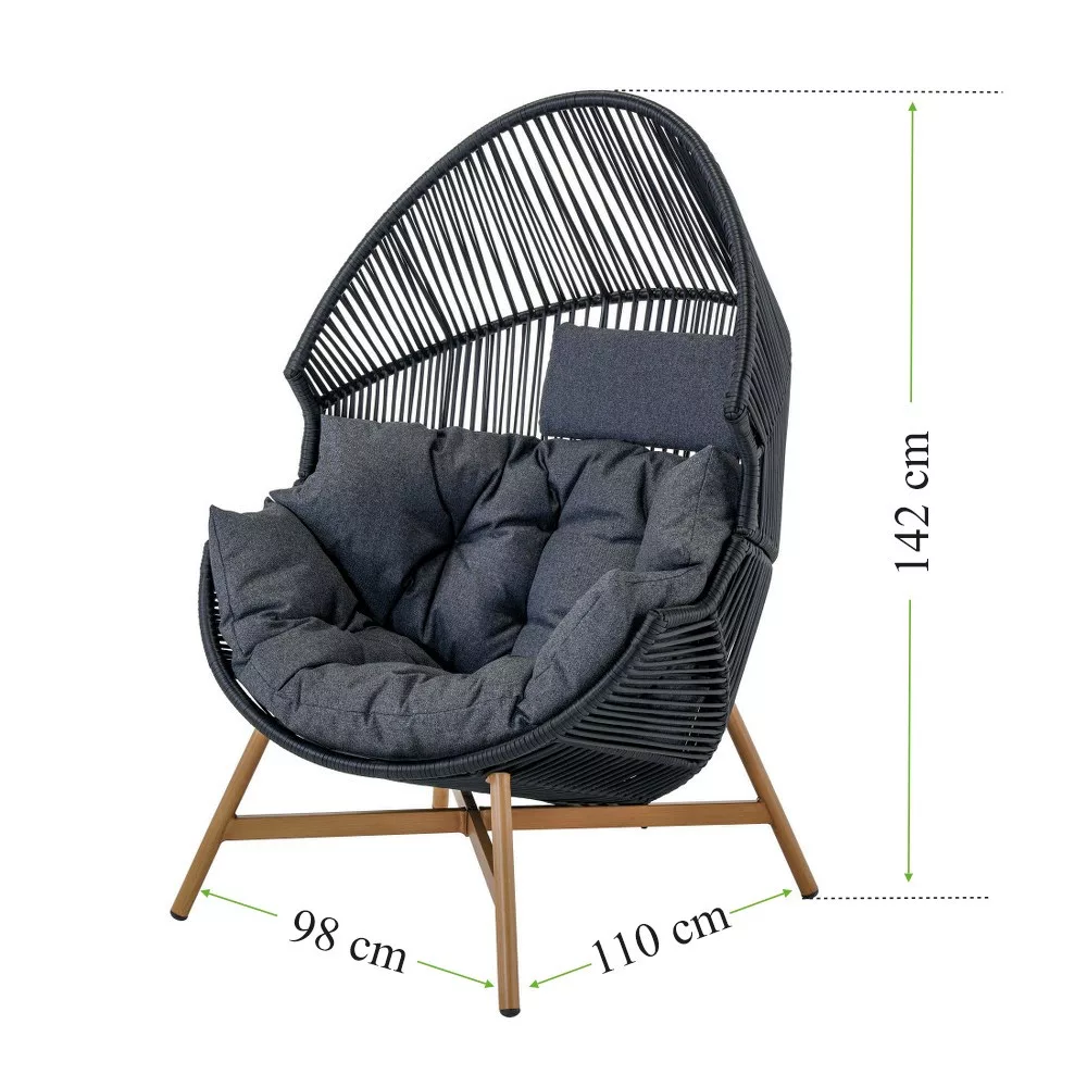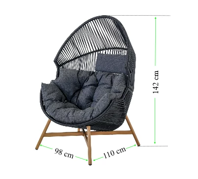 Piękny i stylowy fotel rattanowy Holand oferuje dużo miejsca i maksymalny komfort dzięki swoim wymiarom i wyjątkowo dużej poduszce. Wykonany z wysokiej jakości poliestru, który jest odporny na zużycie, zabrudzenia i wilgoć. Kolorystyka jest ciemnoszara, idealna do salonu lub ogrodu. Wycięcia na konstrukcji służą jako podłokietniki, na przykład podczas czytania książki. Stalowe nogi fotela zapewniają stabilność i solidność, a ich uzupełnieniem są drewniane nóżki. Siedzisko wykonane jest z płaskiego czarnego poliuretanu. Dzięki zastosowanym materiałom jest łatwy w utrzymaniu i czyszczeniu. Wymiary całkowite (WxDxD): 98x110x142 cm, maksymalne obciążenie 130 kg.