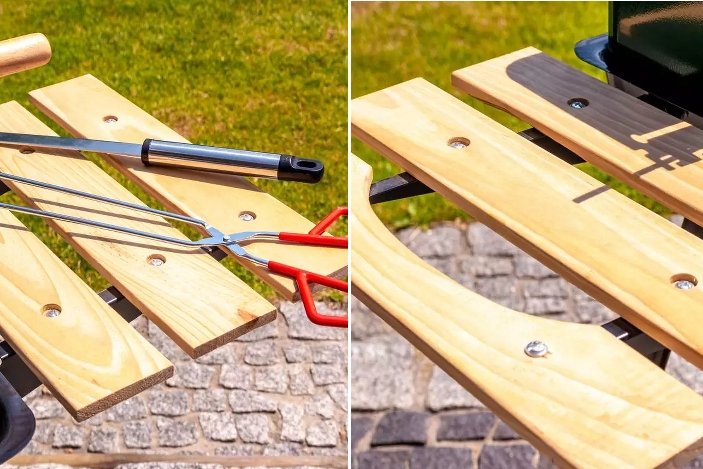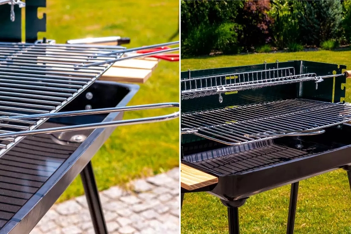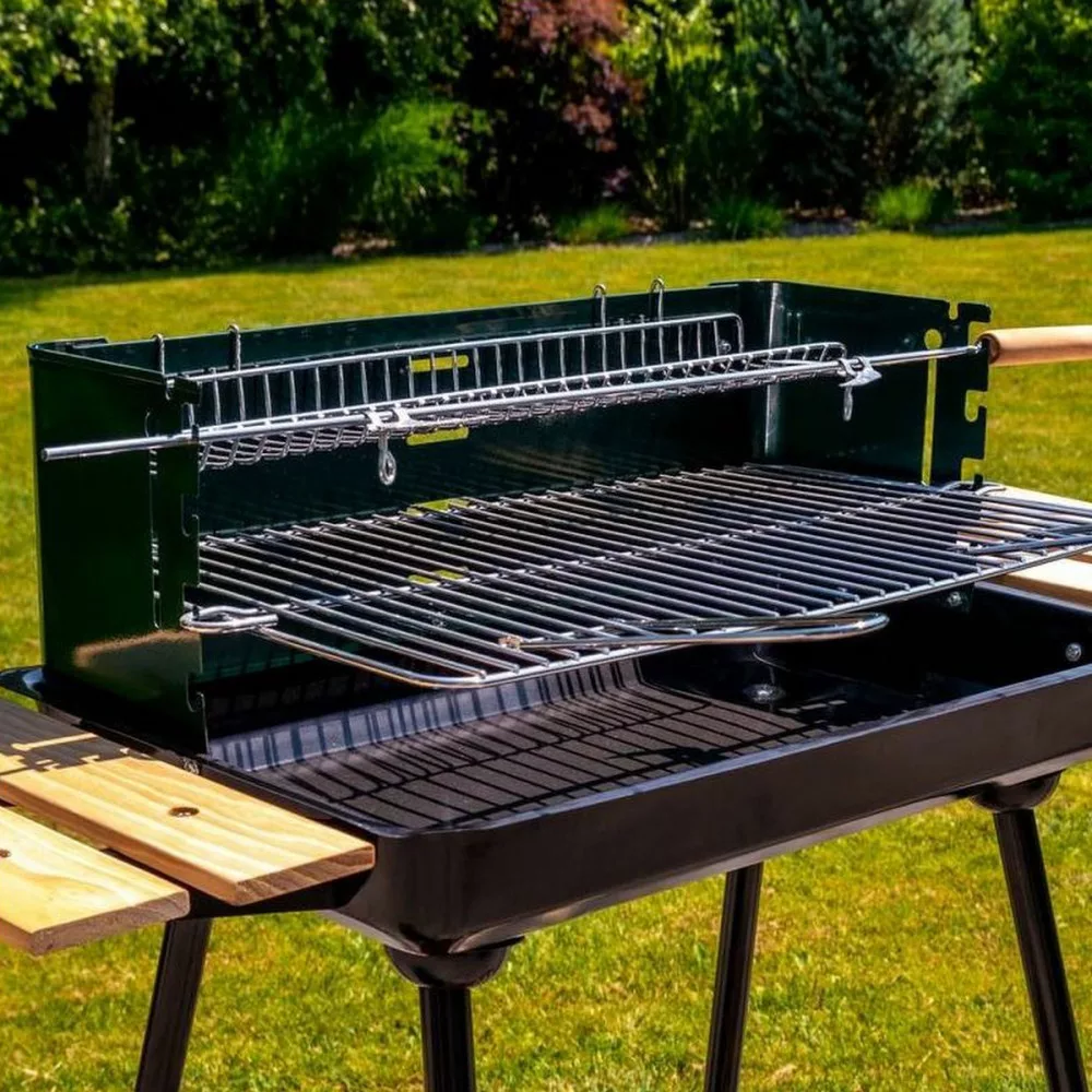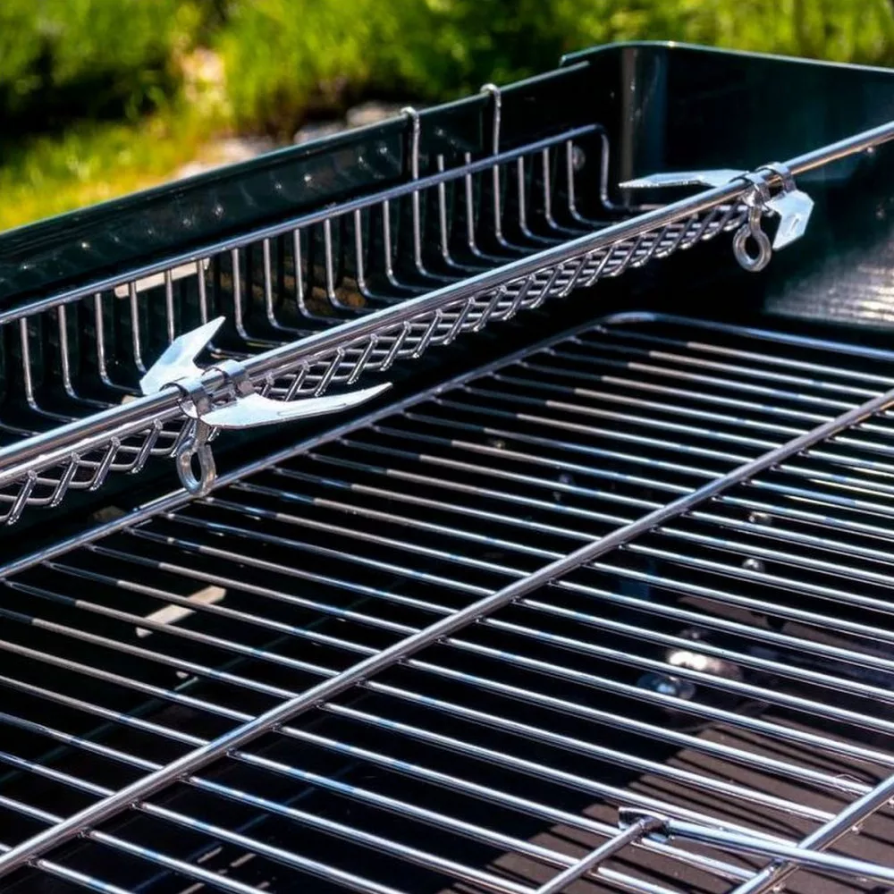 Chromowany grill ogrodowy posiada opcję regulacji wysokości, co pozwala dostosować stopień wysmażenia do własnych potrzeb. Ruszt grilla ogrodowego posiada uchwyty umożliwiające zmianę wysokości. Funkcjonalną zaletą jest dolna półka i półkiboczne , które ułatwiają grillowanie i przechowywanie praktycznych akcesoriów.
