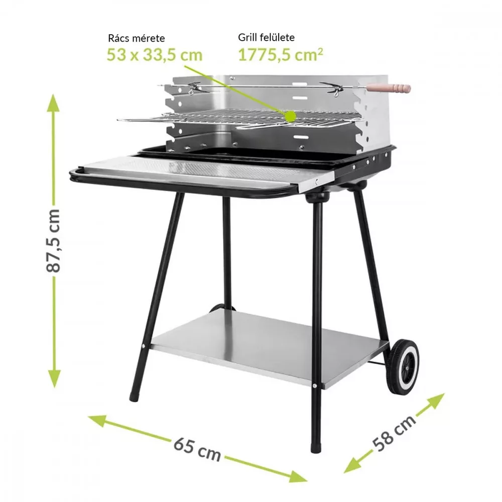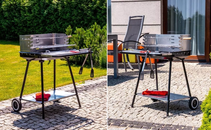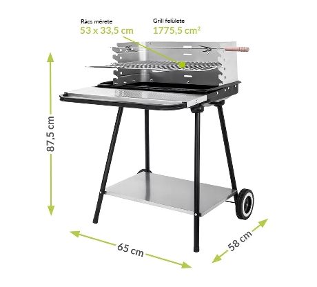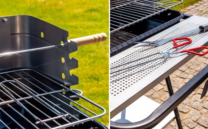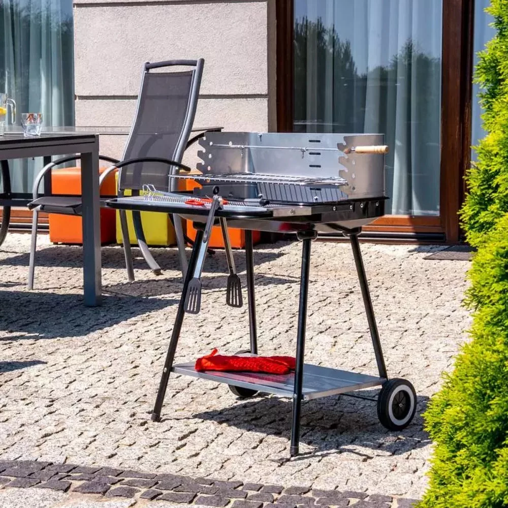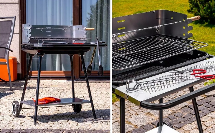 Grill na węgiel drzewny posiada możliwość regulacji wysokości rusztu, co pozwala kontrolować przygotowanie potraw i przyrządzić je do perfekcji. Funkcjonalną zaletą jest dolna i przednia półka, które ułatwiają grillowanie i przechowywanie praktycznych akcesoriów.
