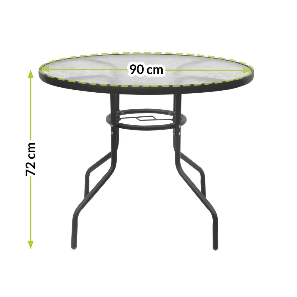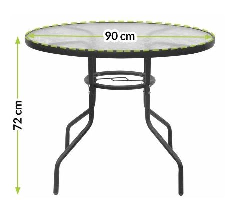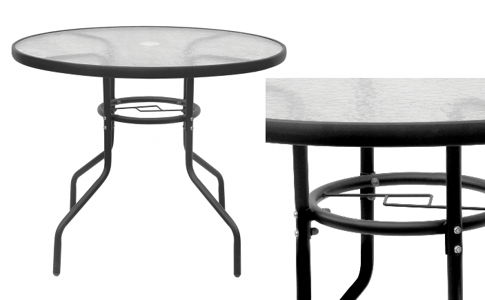 Konstrukcja stołu ogrodowego wykonana jest ze stali. Blat wykonano z 5 mm szkła hartowanego, które jest odporne na drobne zarysowania. Zastosowane materiały zapewniają odporność na warunki atmosferyczne.
