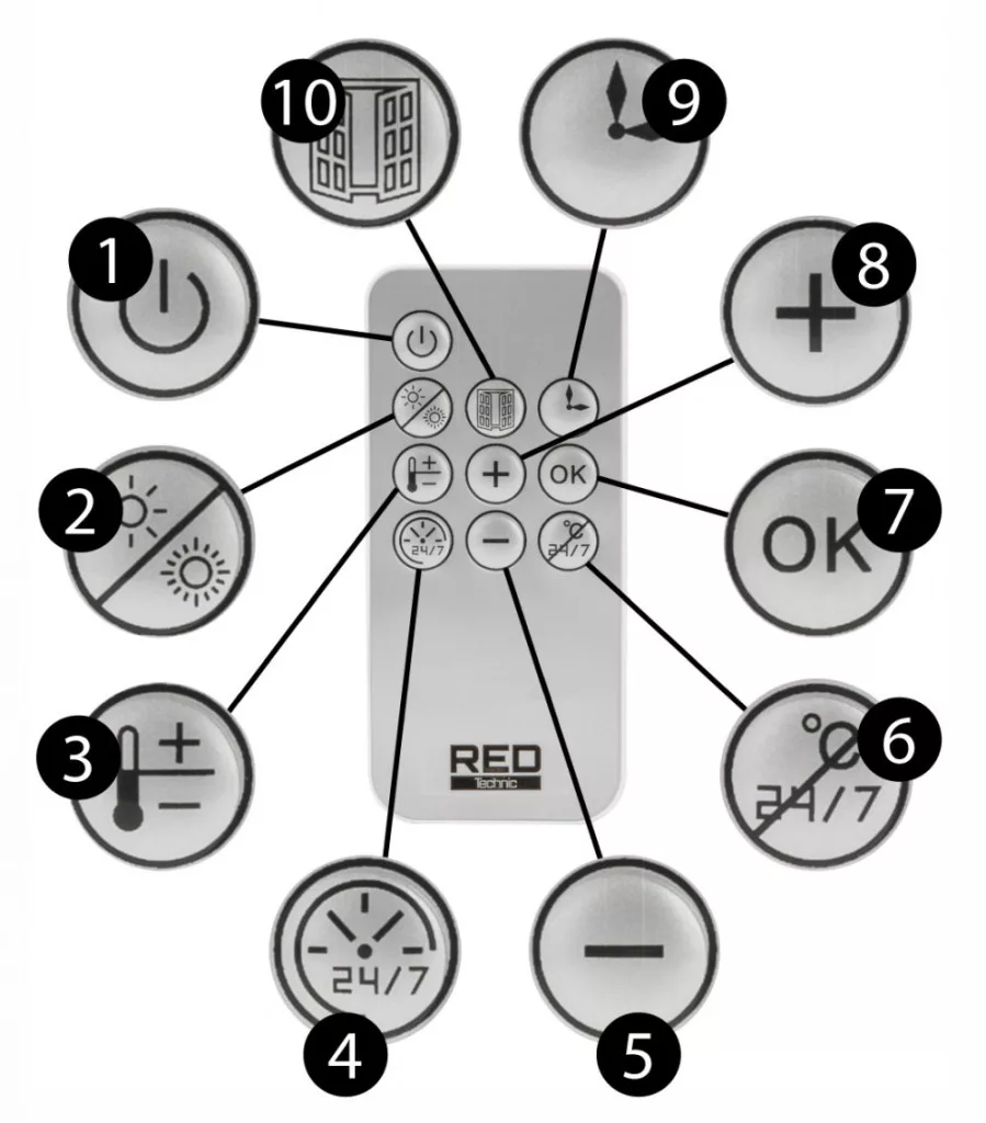 - Przycisk aktywacji ustawionej temperatury przyciskami +/-