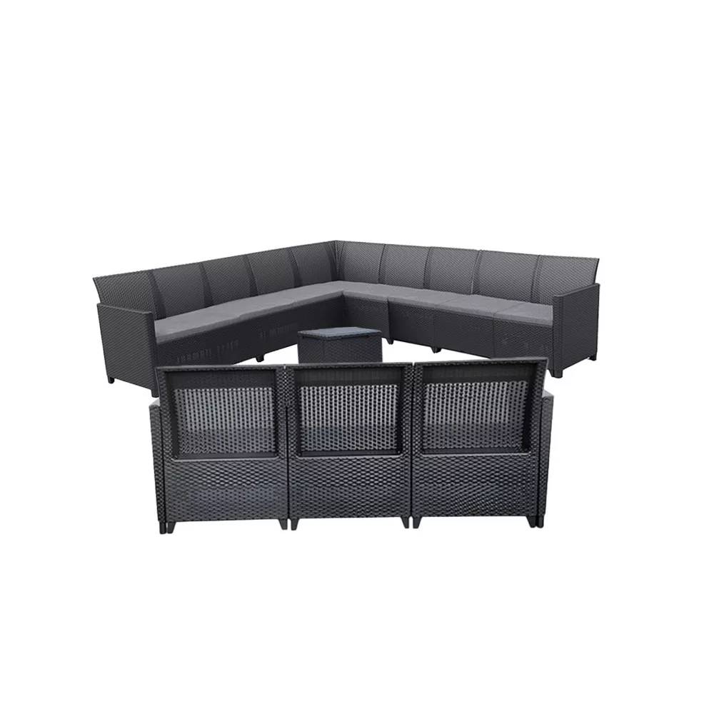 Ez a Grafit színű rattan hatású kerti bútor szett két fotellel, egy 9 személyes sarokkanapéval, egy 3 személyes kanapéval és egy tárolós asztallal rendelkezik, amelyeket időjárásálló műanyagból készítettek, így nem kell aggódnod a UV sugárzás hatásaitól sem. A 3 személyes kanapé magassága: 74 cm, szélessége: 163 cm, hossza: 65 cm. A kanapé párnával rendelkezik, mely kényelmessé teszi és színben passzol a bútorhoz. Az asztal magassága: 37 cm, szélessége: 37 cm, hossza: 37. Az asztal több funkciós, így a tároló részében elrejtheted a kerti eszközöket.