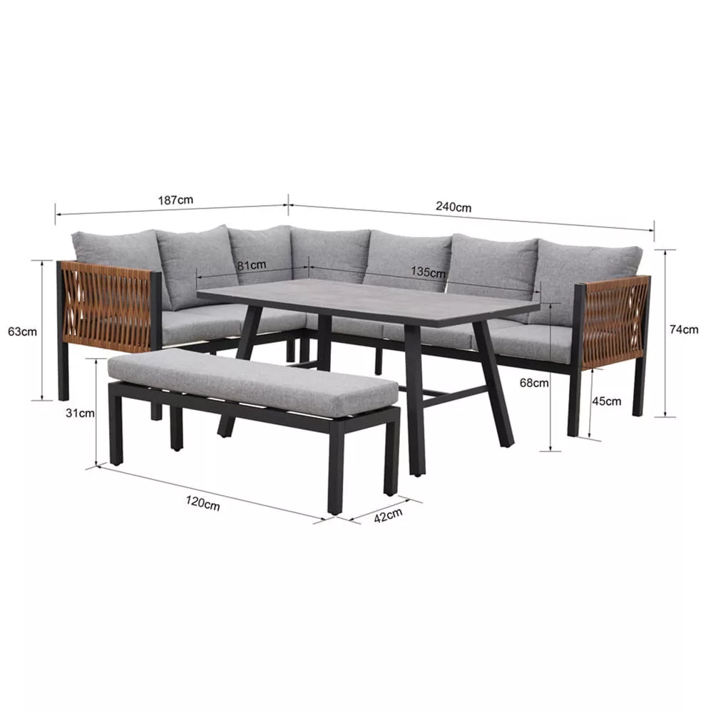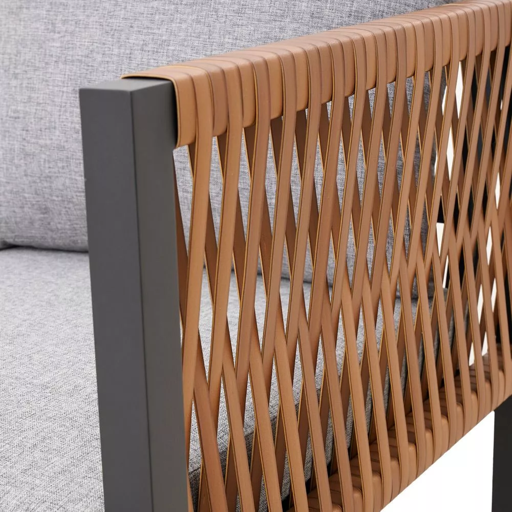 A porszórt alumínium vázzal ellátott kerti bútor fokozott korrózióállóságának köszönhetően tökéletes kültéri használatra. Az anyag stabilan tartja a formáját és nem deformálódik. A lapos szintetikus rattanból szőtt szerkezettel kombinálva olyan bútort alkot, amelyek több évszakon át kitart minőségromlás nélkül. A felhasznált anyagokat nem csak a kedvezőtlen időjárási viszonyokkal szembeni fokozott ellenállás jellemzi, hanem könnyen tisztán is tarthatók. Az ülő- és hátpárnák sodrott poliészterből készülnek, amelyet fokozott nedvességállóság jellemez, és könnyen tisztítható. A felhasznált anyagoknak köszönhetően a bútor hosszú ideig használható.