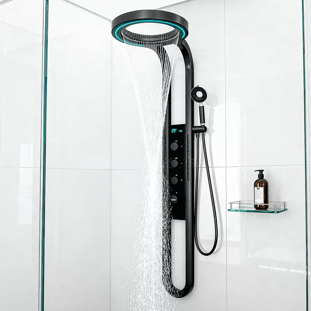 A zuhanypanel rozsdamentes acélból készült, amely garantálja a hosszú élettartamot és a prémium megjelenést. A fekete szín modern eleganciát sugároz, amely bármely fürdőszobai környezethez illeszkedik.