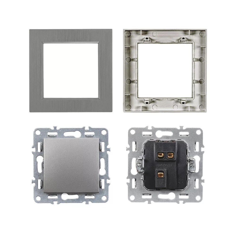 Ez a modell gyárilag tartalmazza a szürke Nova egyes keretet, így a kapcsoló telepítés után azonnal egységes, rendezett megjelenést nyújt. A lekerekített perem és a kompakt 83 × 83 mm-es méret modern, letisztult stílust képvisel, amely harmonizál a legtöbb beltéri enteriőrrel.
