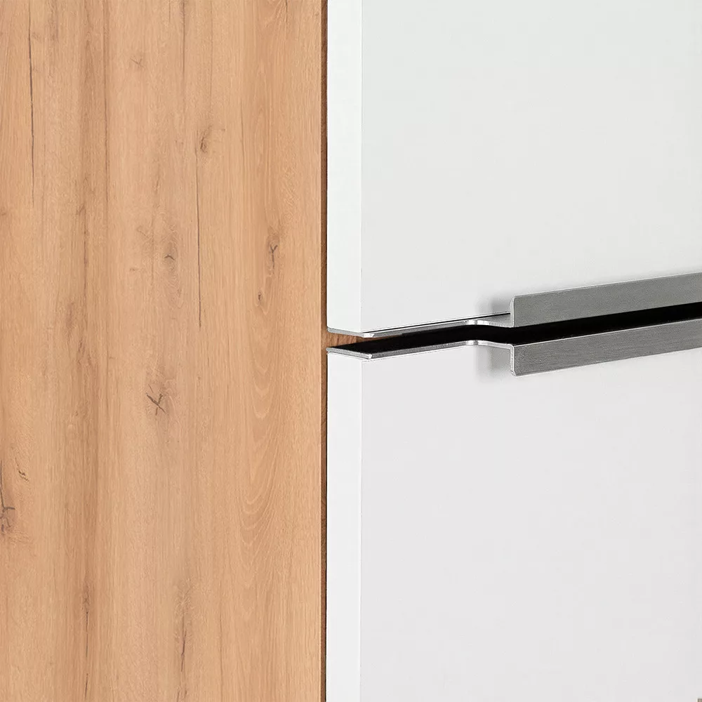 A felfüggesztett kivitelű Vario Trim 35 függesztett oldal szekrény modern, letisztult megjelenést ad a fürdőszobának, miközben megkönnyíti a mindennapi takarítást: a padló szabadon marad alatta, így a tér tágasabbnak, rendezettebbnek hat. A bútor ajtaja balra és jobbra egyaránt felszerelhető, ami különösen előnyös kisebb alapterületű fürdőszobákban, ahol minden centiméter számít. A szekrény tartós bútorlapból készül, amely ellenáll a mindennapos fürdőszobai páratartalomnak. A felületek könnyen tisztíthatók. A Trim fém fogantyúprofil tovább erősíti a bútor elegáns, modern karakterét; kényelmes használatot biztosít, és harmonikusan illeszkedik az tölgy-fehér felületek kifinomult megjelenéséhez.