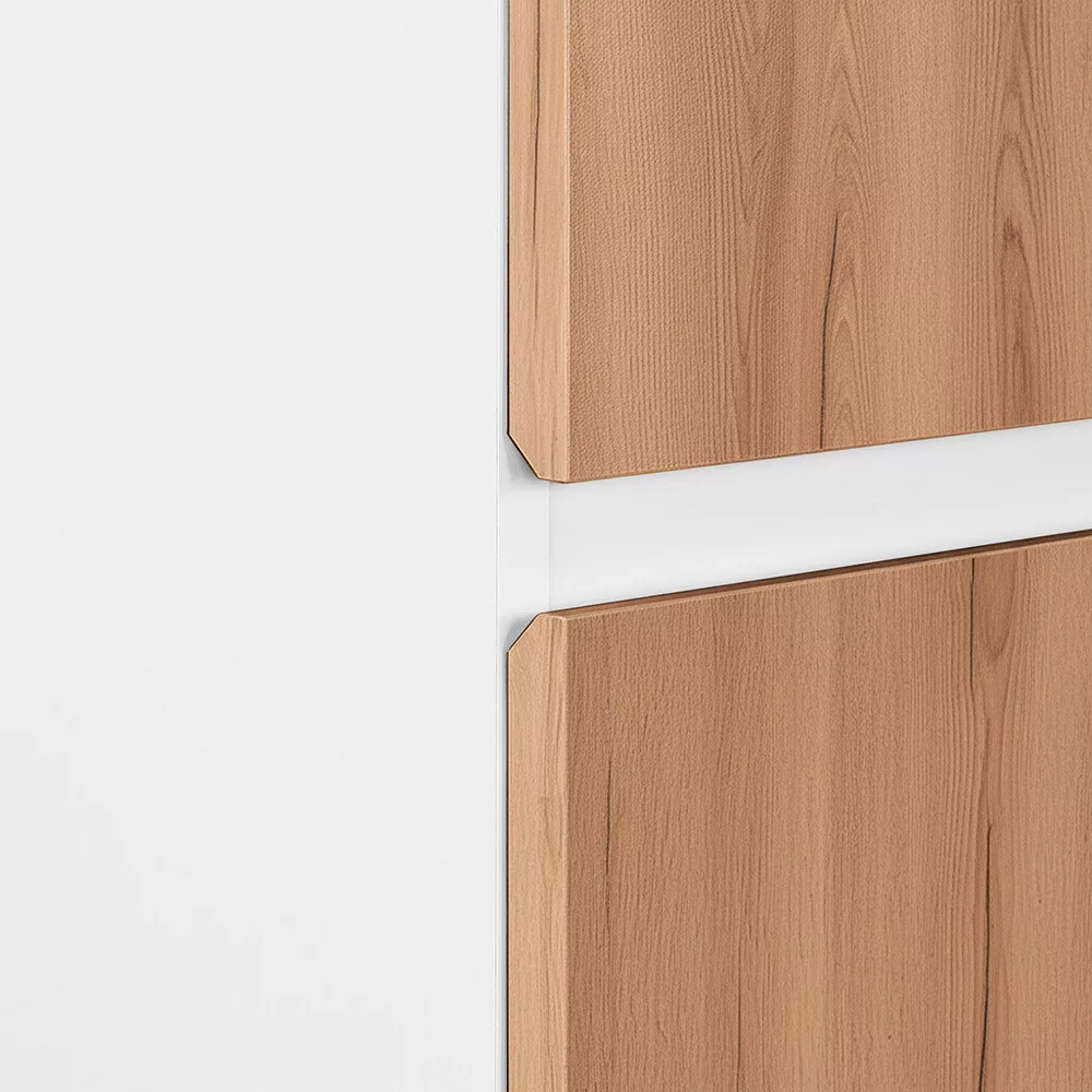 A szekrény tartós bútorlapból készül, amely ellenáll a mindennapos fürdőszobai páratartalomnak. A Vario Forte családra jellemző 45°-os élzárás elegáns, modern hatást ad, miközben precíz és igényes kivitelezésről árulkodik. A felületek könnyen tisztíthatók.